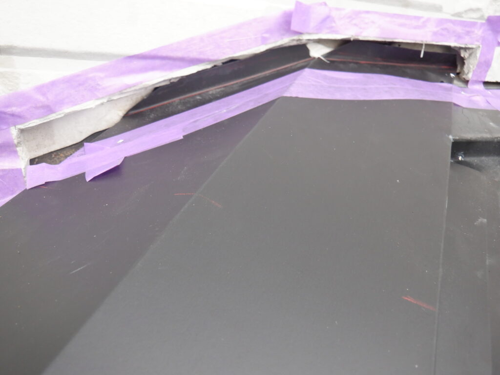 大屋根部分は完成です。つぎは下屋を施工していきます。下屋は壁際のサイディングを切って棟の立ち上がりを少しでも入れてあげる必要があります。これやらないで差し込むだけだと雨漏りするケースがあります。