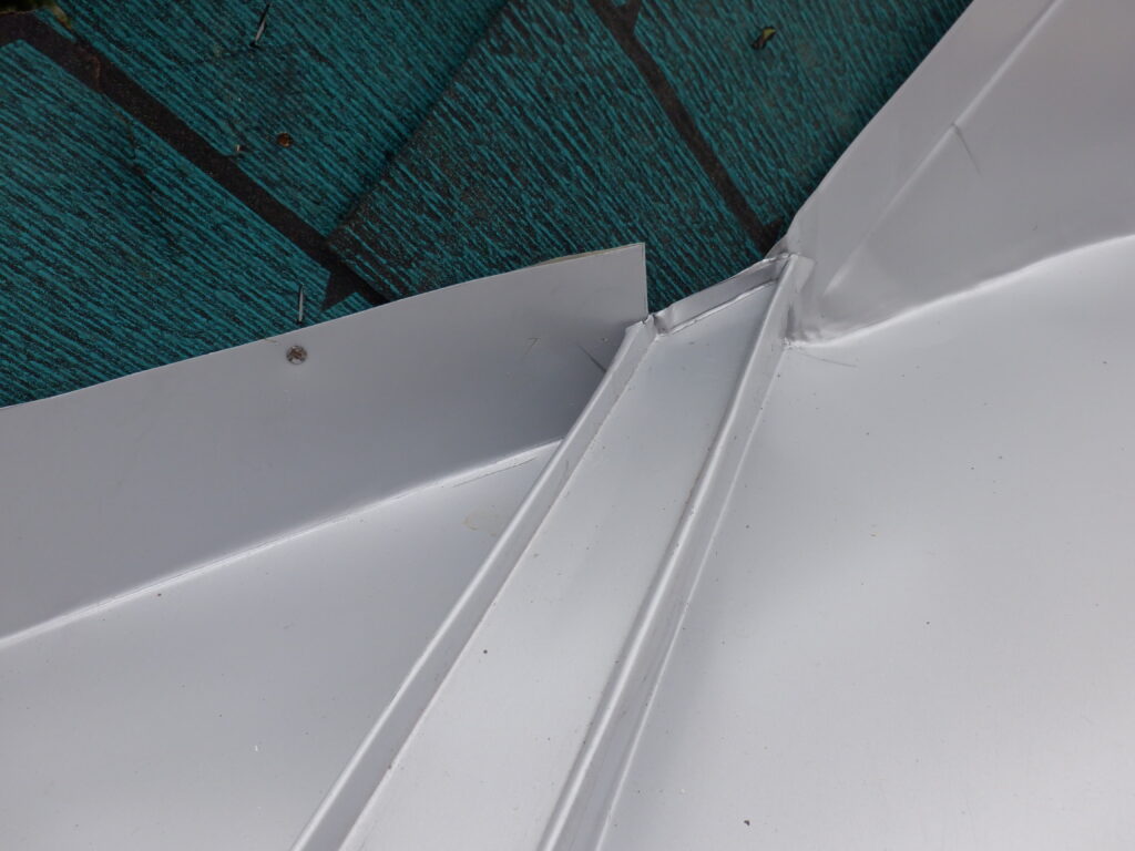 屋根板の1㎝返っている部分とキャップを巻き込む形で絞めこんでいきます。(三晃葺きの古い工場の雨漏りはこのガチャ掛けが失敗したままで雨漏りしているケースも多い)水上に立ち上げが小さいですがつけていないと台風などの吹込み雨で雨漏りの原因になりかねないので細かいところですがしっかり施工します。
